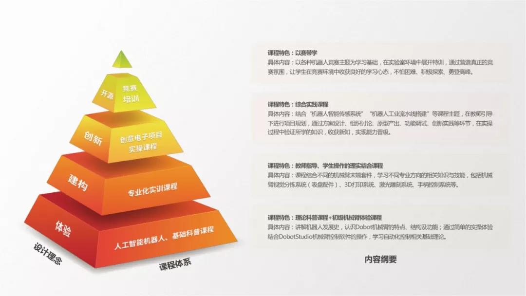 越疆在自有產(chǎn)品的基礎(chǔ)上,利用在機器人和人工智能領(lǐng)域豐富的項目經(jīng)驗和行業(yè)經(jīng)驗,為學校提供定制化的實驗室配置方案。實驗室作為學生自由創(chuàng)作的場所,整體的設(shè)計上完全區(qū)別于傳統(tǒng)的課堂設(shè)計。越疆人工智能實驗室有多種教學工具、內(nèi)容服務(wù)、套件,不同的學校可以根據(jù)自己的學校特色選擇套件搭配教學,以達到各自期望的教學效果。