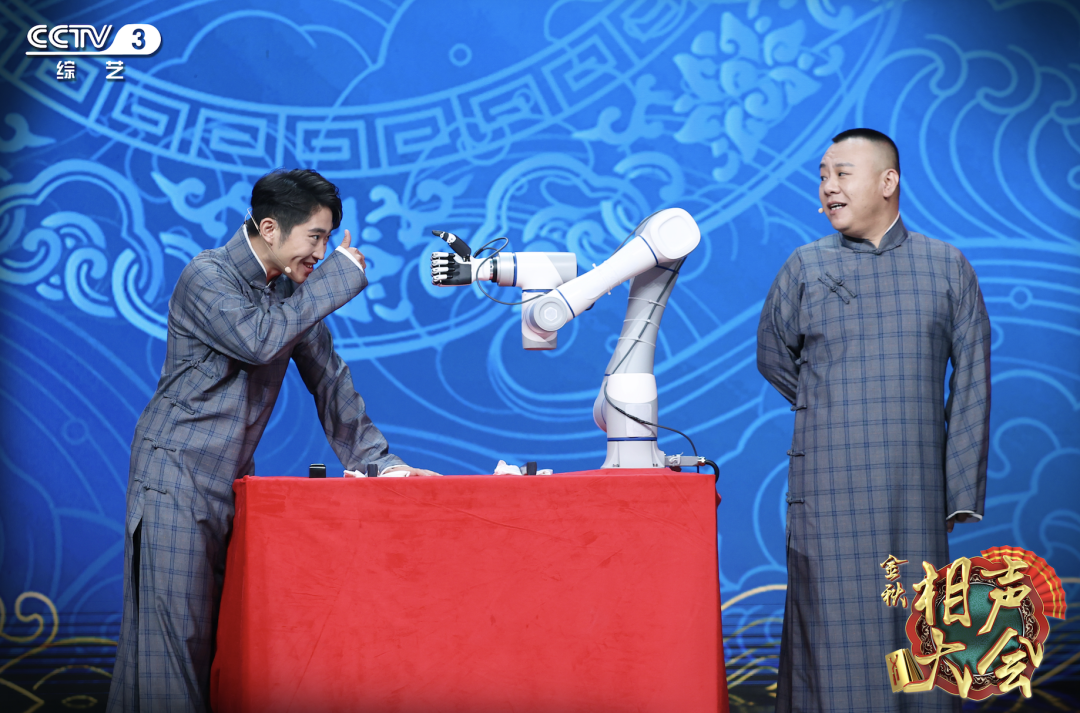 節目之中,CR5 協作機器人搭配仿人五指靈巧手,通過做出比 2、比 3、點贊等示意手勢,巧妙回應了相聲演員的靈魂質問。